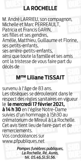 Décédée à La Rochelle (17000, France) le lundi 8 février 2021 à l'âge de 83 ans