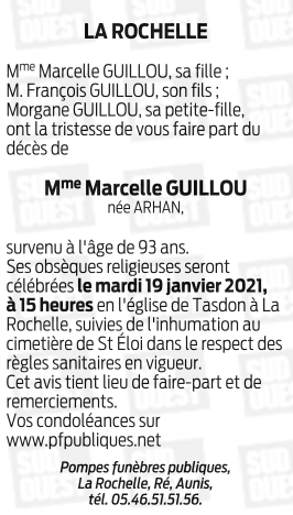 Décédée à La Rochelle (17000, France) le vendredi 15 janvier 2021 à l'âge de 93 ans