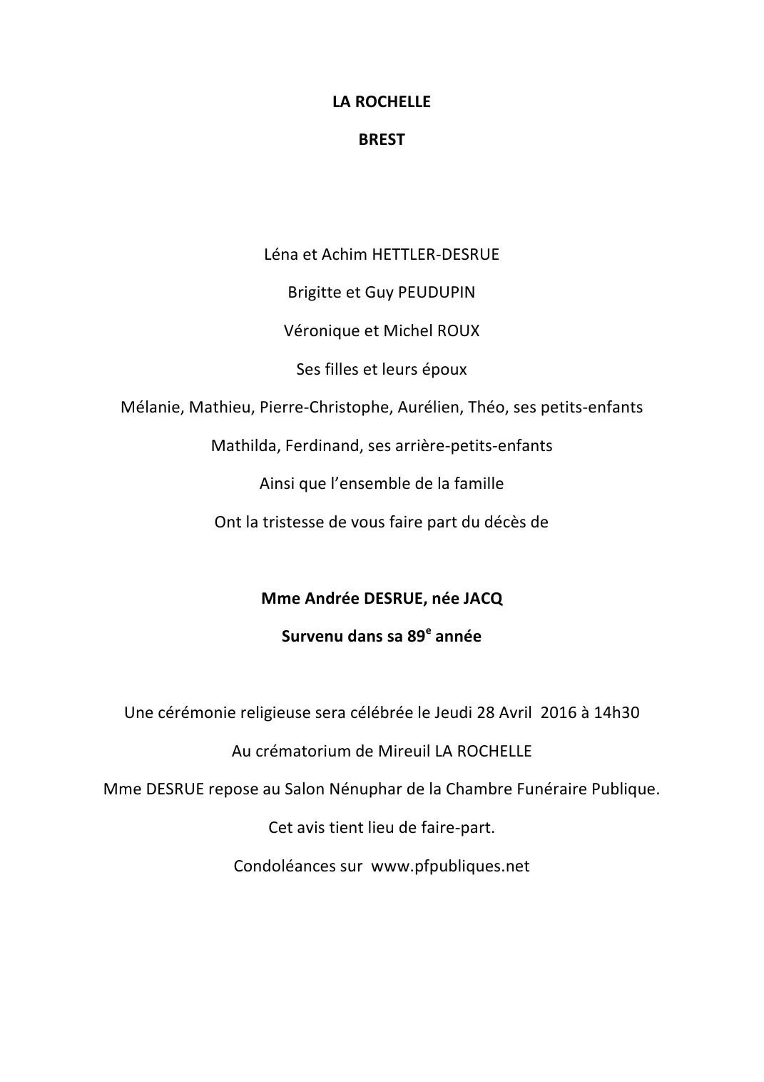Décédée à La Rochelle (17000, France) le vendredi 22 avril 2016 à l'âge de 88 ans