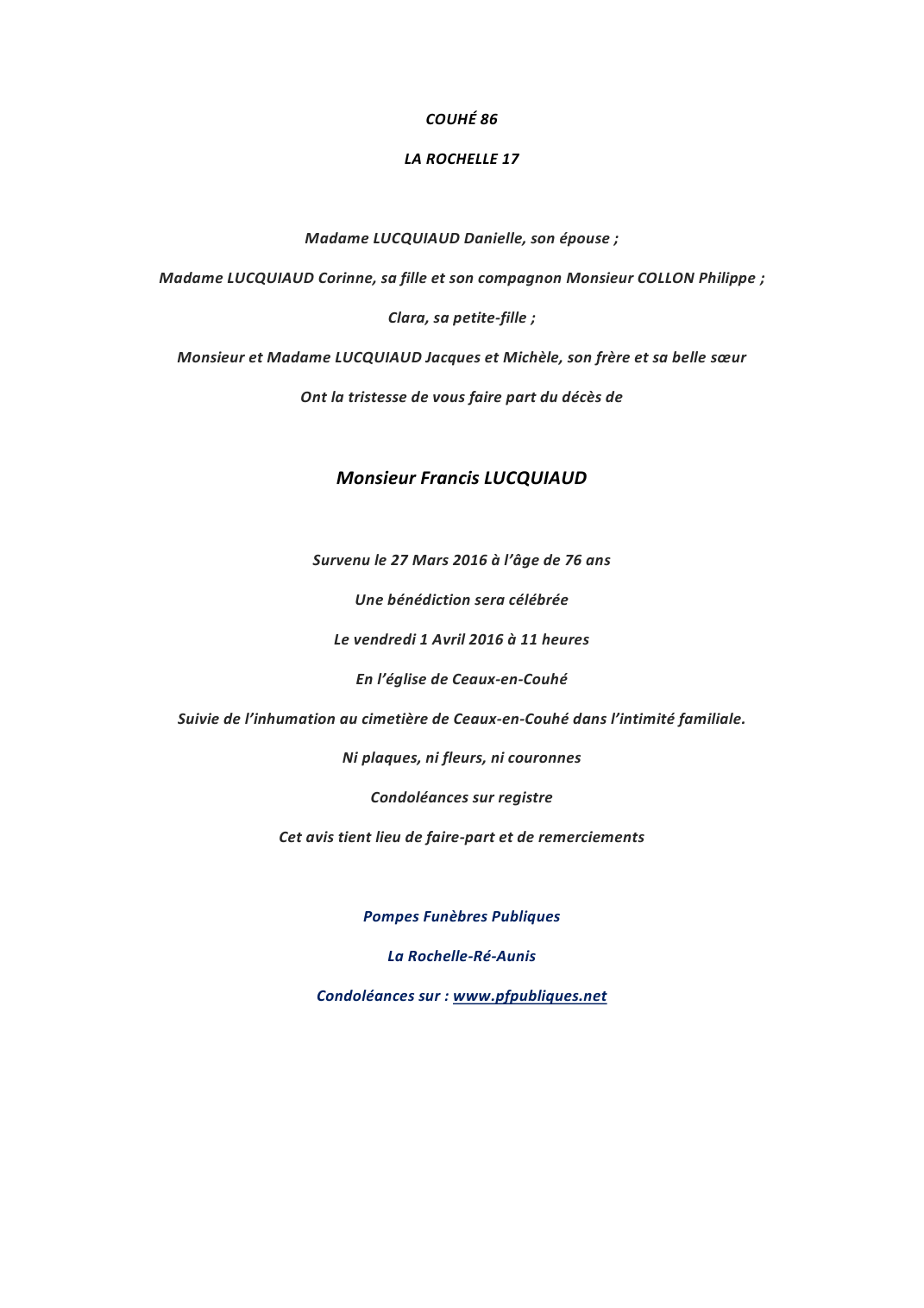 Décédé à La Rochelle (17000, France) le dimanche 27 mars 2016 à l'âge de 76 ans