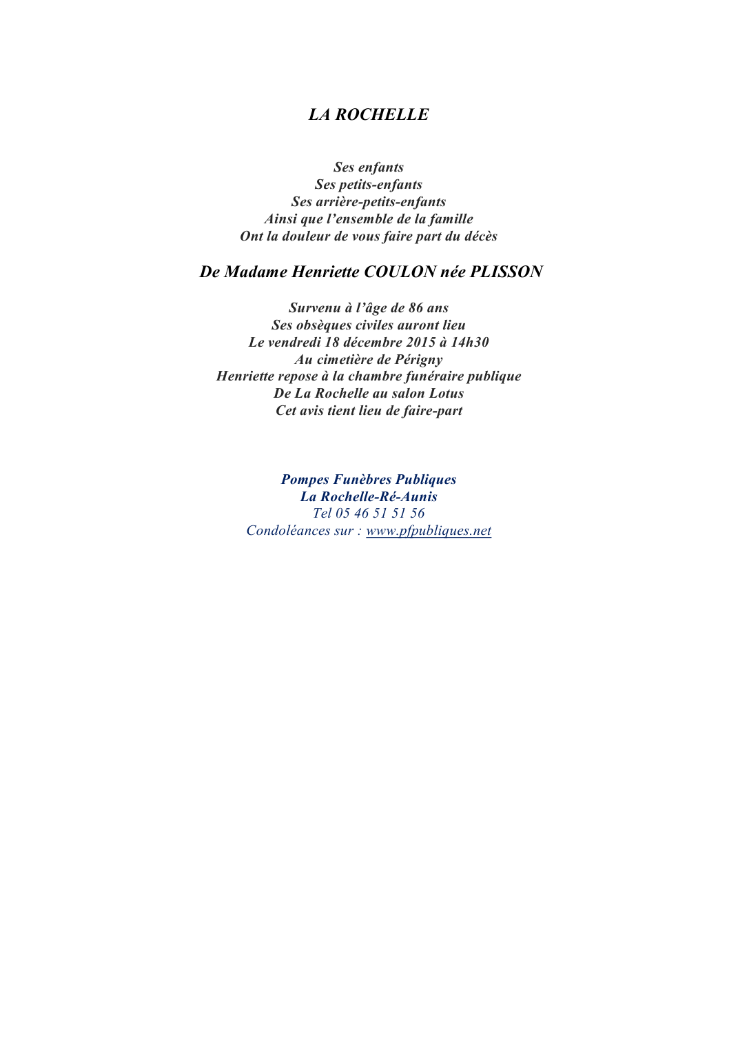 Décédée à La Rochelle (17000, France) le mardi 15 décembre 2015 à l'âge de 86 ans