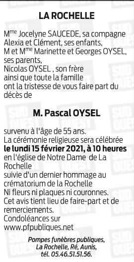 Décédé à La Rochelle (17000, France) le vendredi 5 février 2021 à l'âge de 56 ans