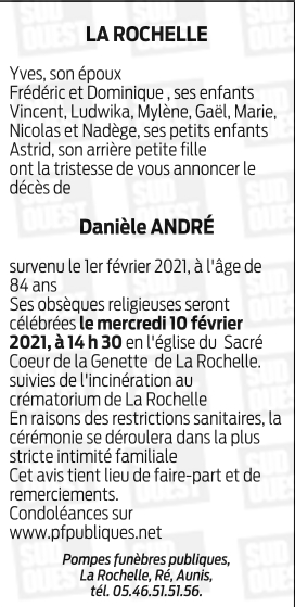 Décédée à La Rochelle (17000, France) le lundi 1 février 2021 à l'âge de 84 ans