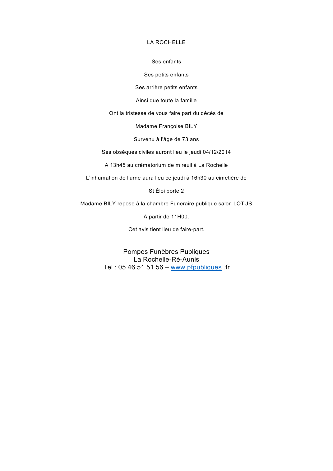 Décédée à La Rochelle (17000, France) le lundi 1 décembre 2014 à l'âge de 73 ans