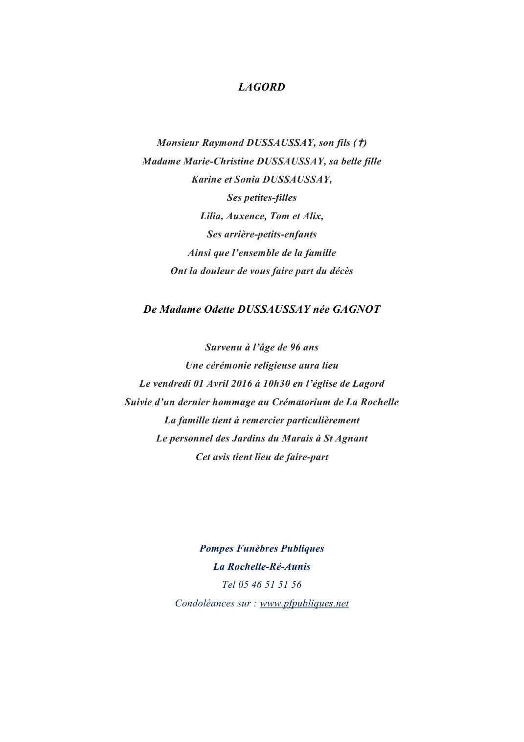 Madame Odette DUSSAUSAY née GAGNOT