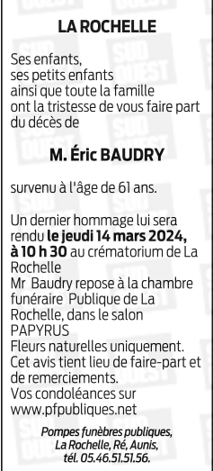 Décédé à La Rochelle (17000, France) le mercredi 6 mars 2024 à l'âge de 61 ans