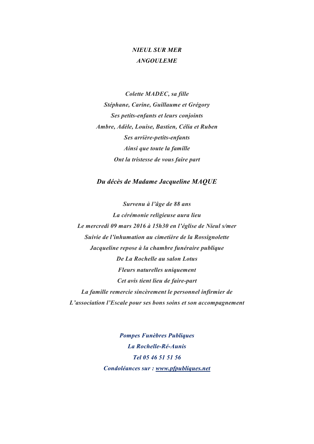 Décédée à Nieul-sur-Mer (17137, France) le vendredi 4 mars 2016 à l'âge de 88 ans