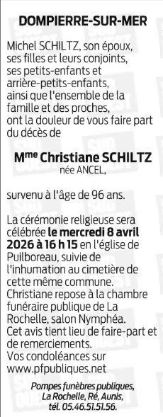 Décédée à La Rochelle (17000, France) le mercredi 1 avril 2026 à l'âge de 96 ans