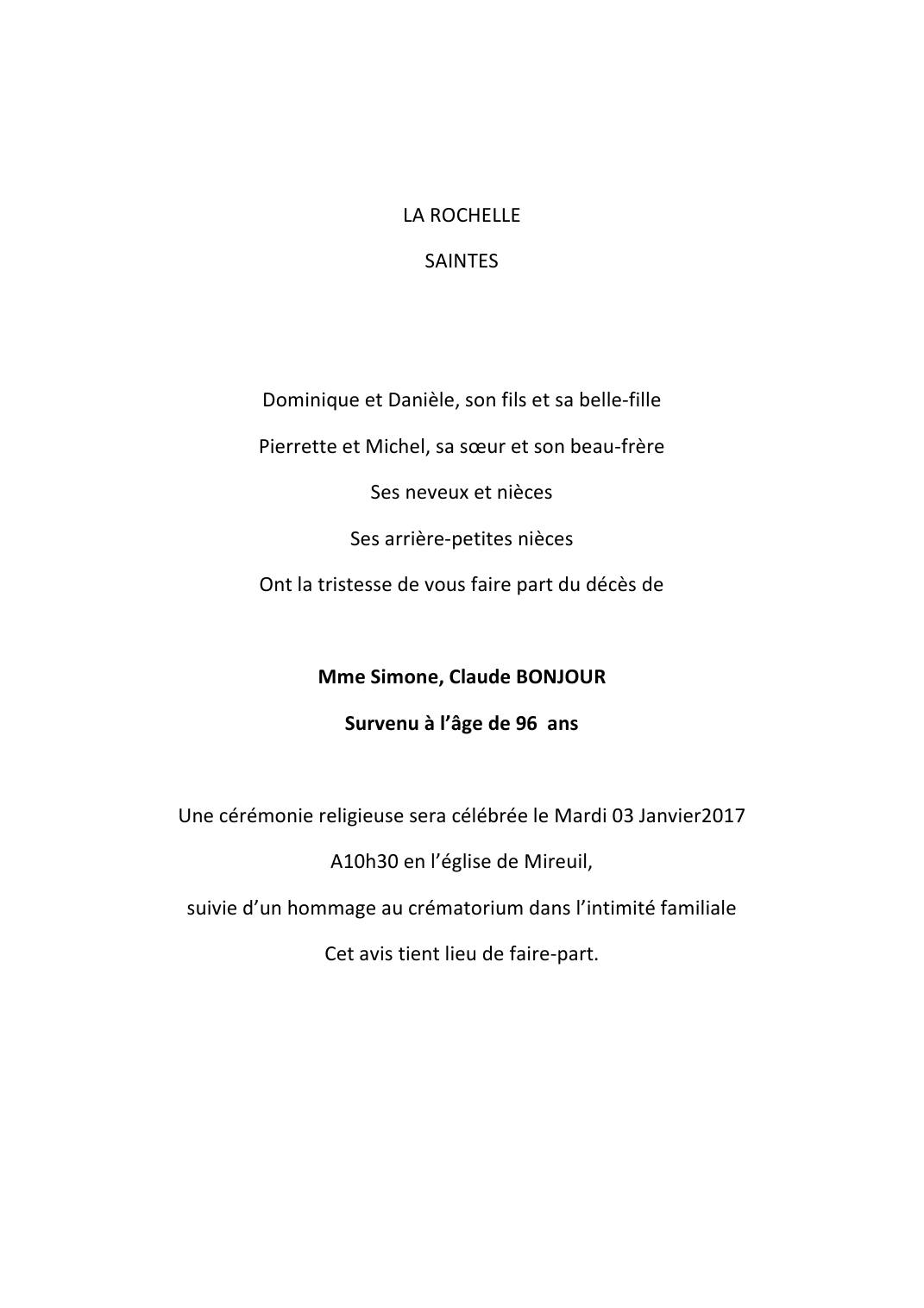 Décédée à Benon (17170, France) le lundi 26 décembre 2016 à l'âge de 96 ans