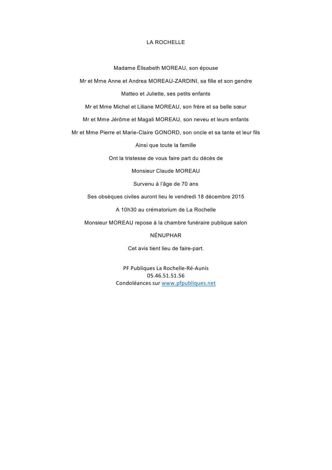 Décédé à La Rochelle (17000, France) le dimanche 13 décembre 2015 à l'âge de 70 ans