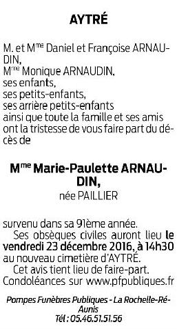 Madame Marie-Paulette ARNAUDIN née PAILLIER