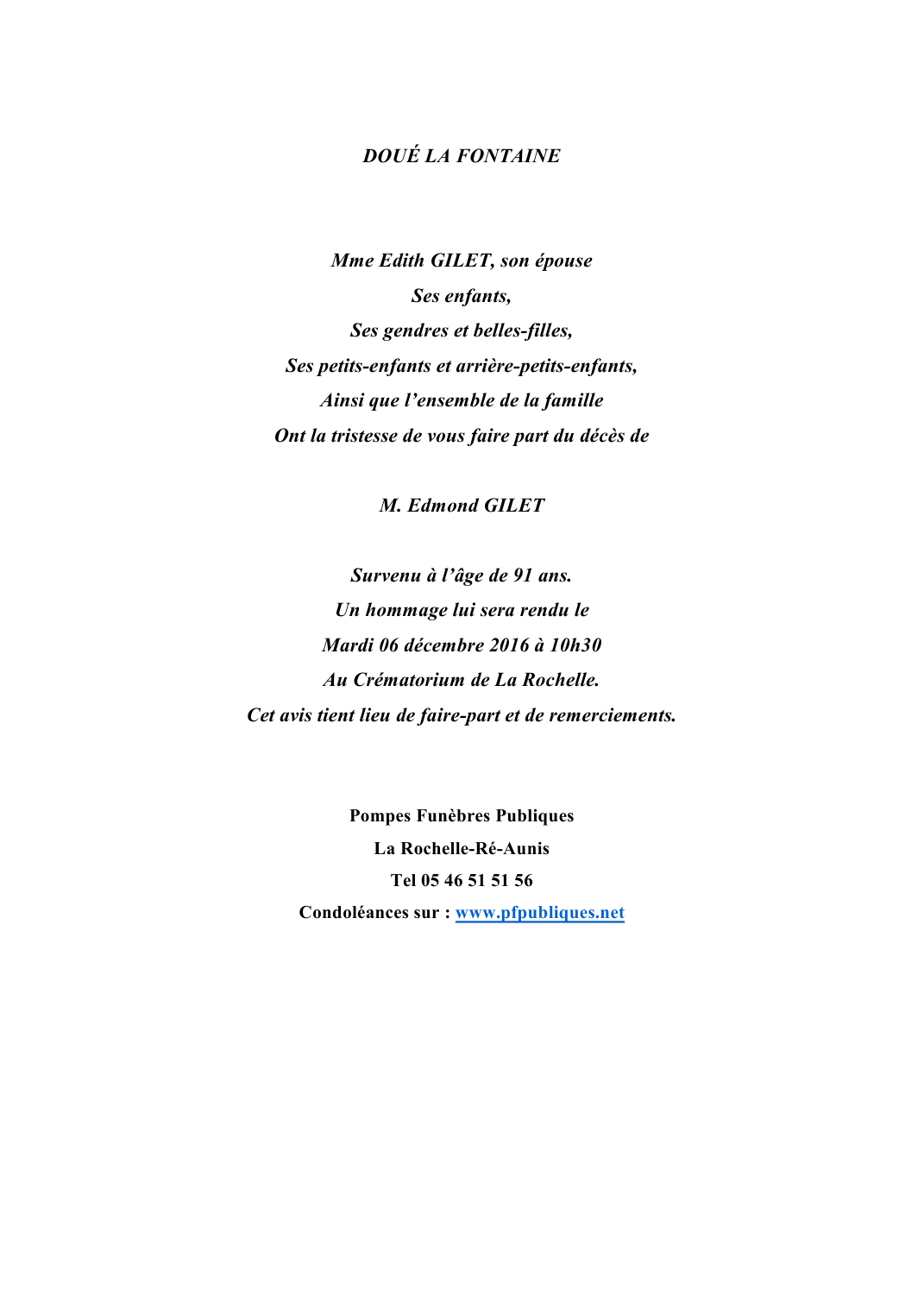 Décédé à La Rochelle (17000, France) le jeudi 1 décembre 2016 à l'âge de 91 ans