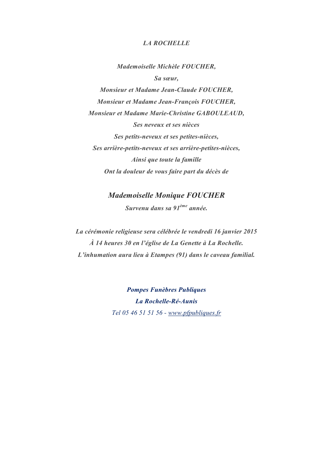 Décédée à La Jarne (17220, France) le lundi 12 janvier 2015 à l'âge de 90 ans