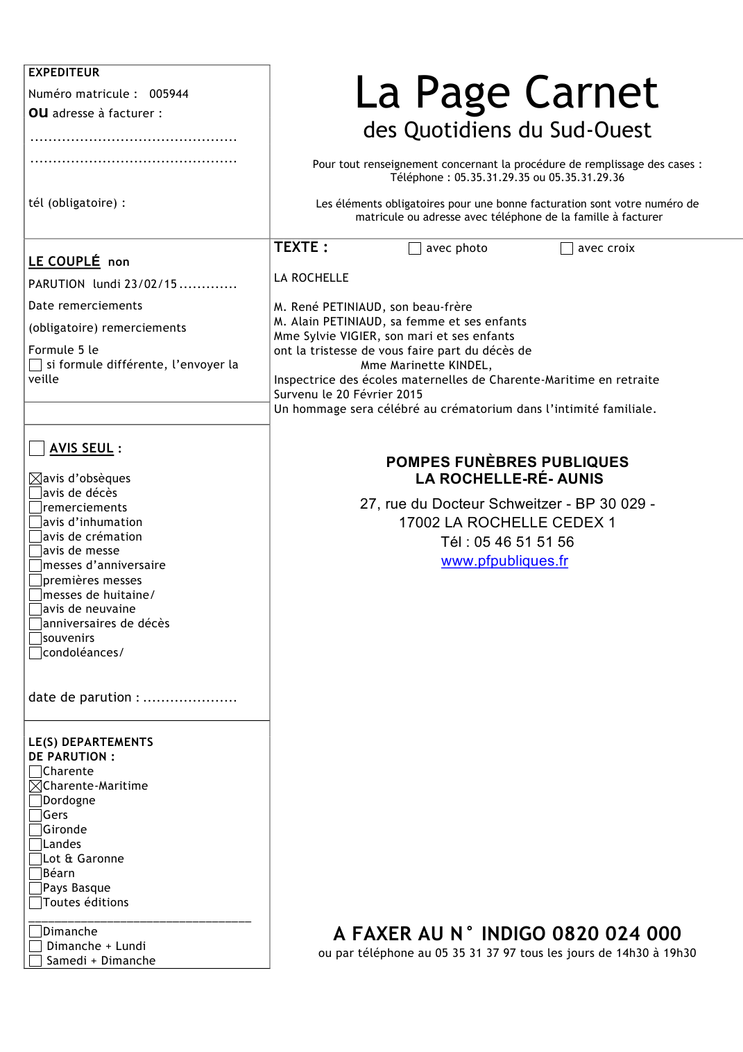 Décédée à La Rochelle (17000, France) le vendredi 20 février 2015 à l'âge de 91 ans