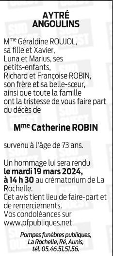 Décédée à Puilboreau (17138, France) le lundi 11 mars 2024 à l'âge de 73 ans