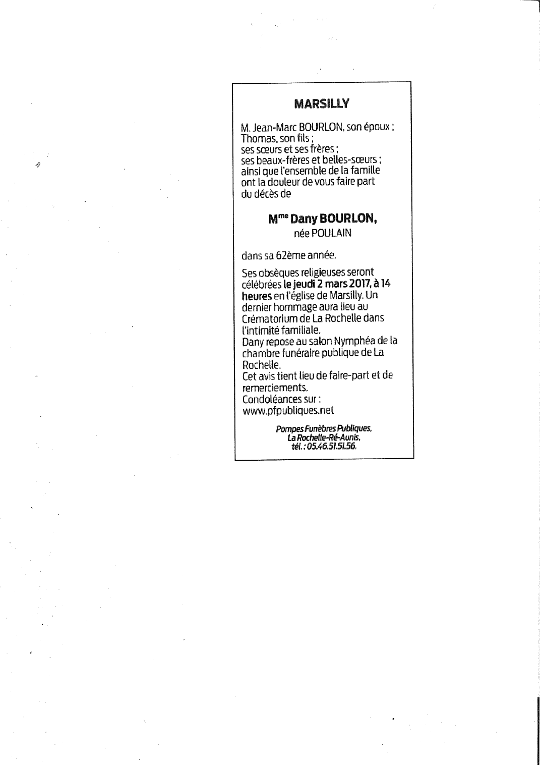 Décédée à Marsilly (17137, France) le samedi 25 février 2017 à l'âge de 61 ans