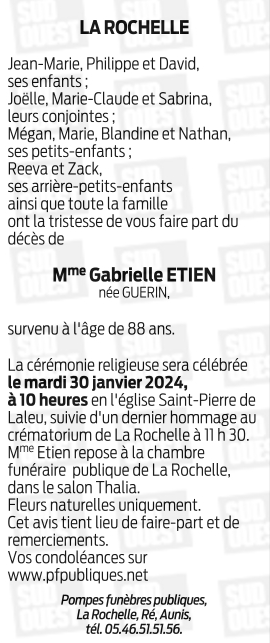 Décédée à La Rochelle (17000, France) le vendredi 19 janvier 2024 à l'âge de 88 ans