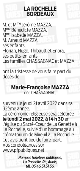Madame Marie-Françoise MAZZA née CHASSAGNAC