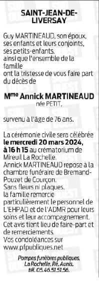Décédée à Marans (17230, France) le mercredi 13 mars 2024 à l'âge de 76 ans