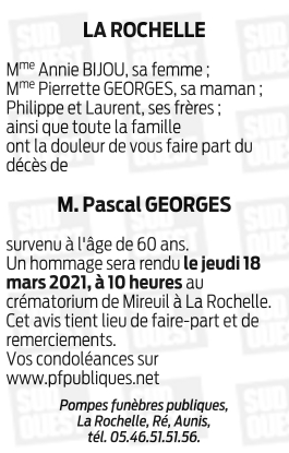 Décédé à La Rochelle (17000, France) le samedi 6 mars 2021 à l'âge de 60 ans