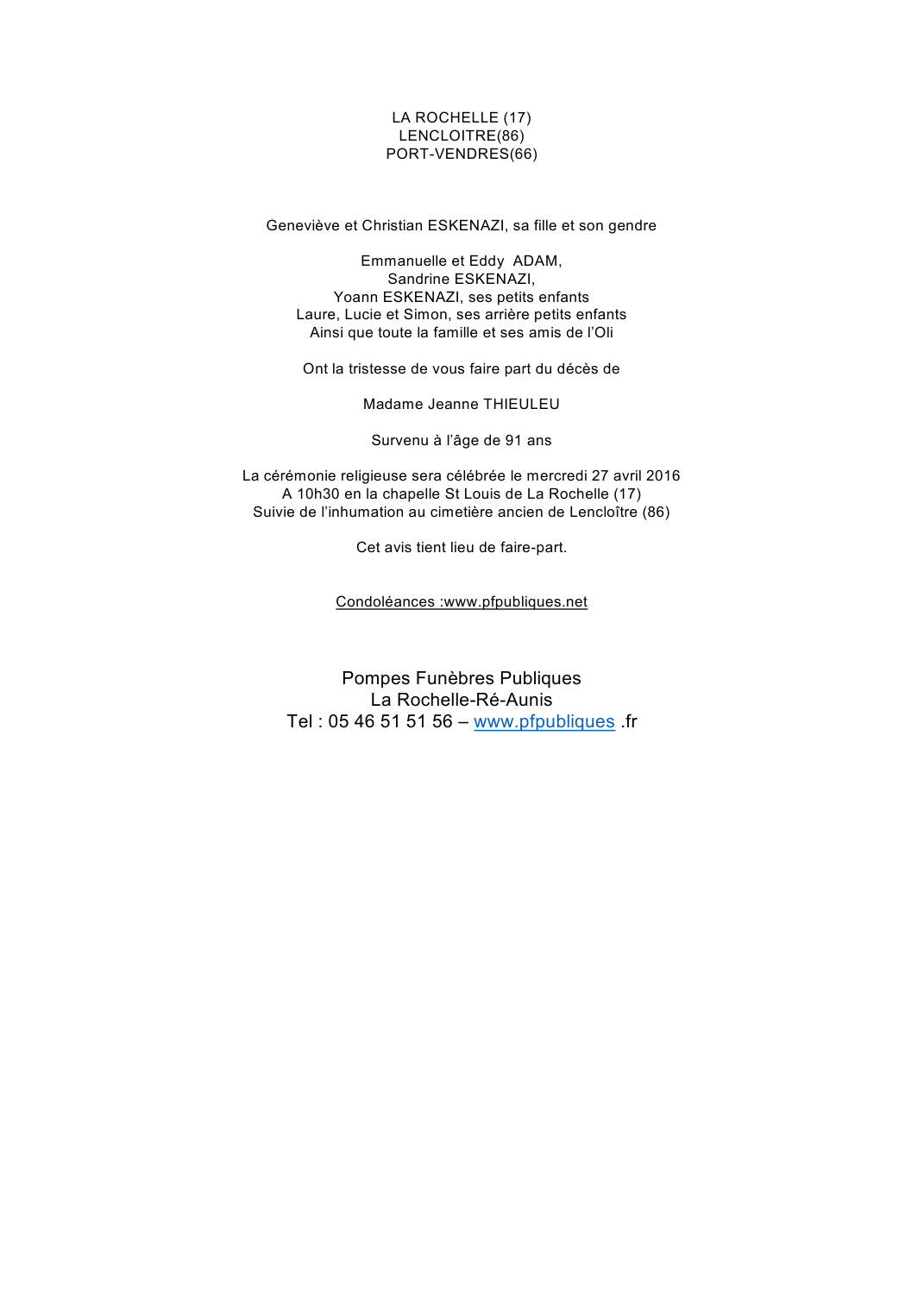 Décédée à La Rochelle (17000, France) le mercredi 20 avril 2016 à l'âge de 91 ans