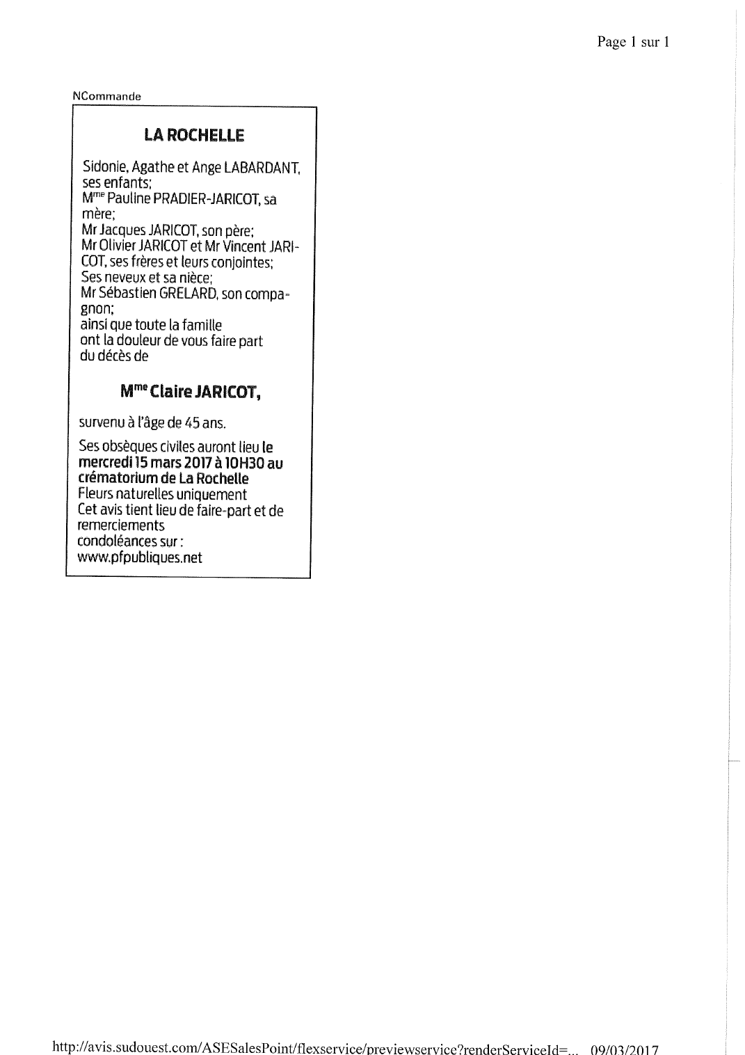 Décédée à Bordeaux (33000, France) le mercredi 8 mars 2017 à l'âge de 45 ans