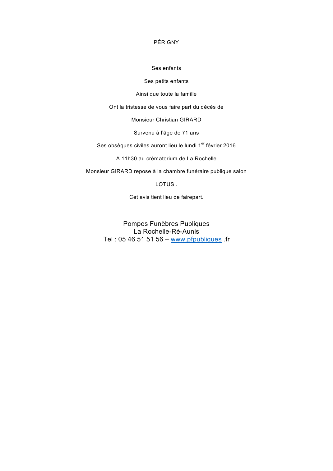 Décédé à Périgny (17180, France) le mardi 26 janvier 2016 à l'âge de 71 ans