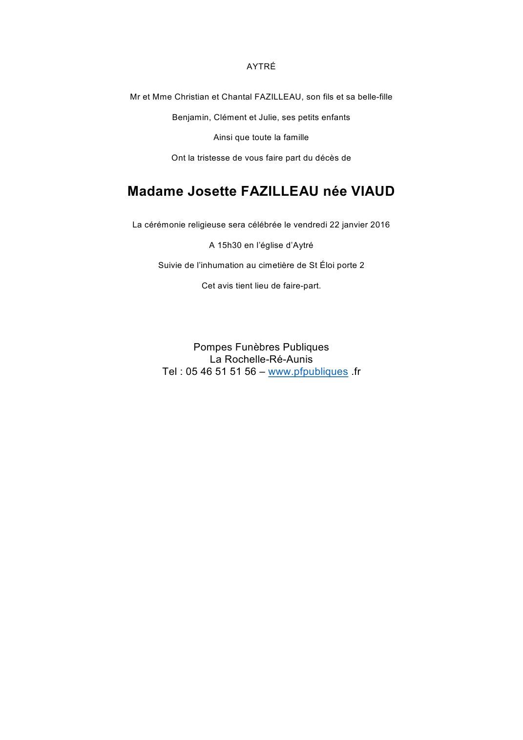 Madame Josette FAZILLEAU née VIAUD