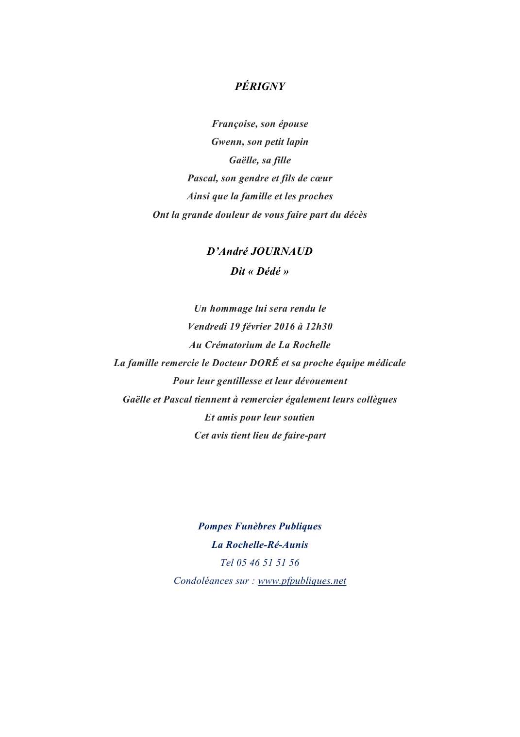 Décédé à La Rochelle (17000, France) le lundi 15 février 2016 à l'âge de 69 ans