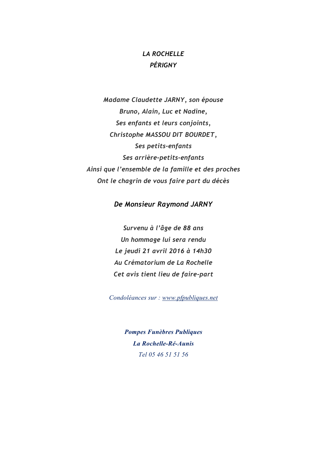 Décédé à Puilboreau (17138, France) le vendredi 15 avril 2016 à l'âge de 88 ans