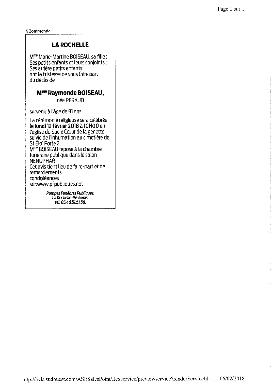Décédée à La Rochelle (17000, France) le mardi 6 février 2018 à l'âge de 91 ans