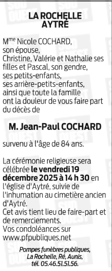 Décédé à Puilboreau (17138, France) le vendredi 12 décembre 2025 à l'âge de 84 ans