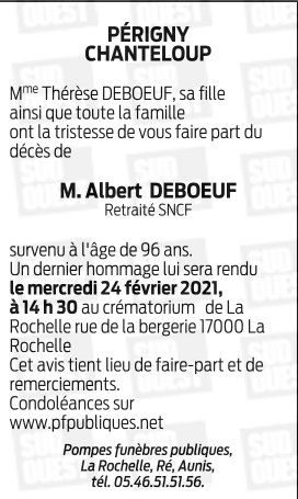 Décédé à La Rochelle (17000, France) le samedi 6 février 2021 à l'âge de 96 ans