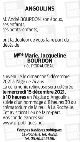Décédée à La Rochelle (17000, France) le dimanche 5 décembre 2021 à l'âge de 74 ans