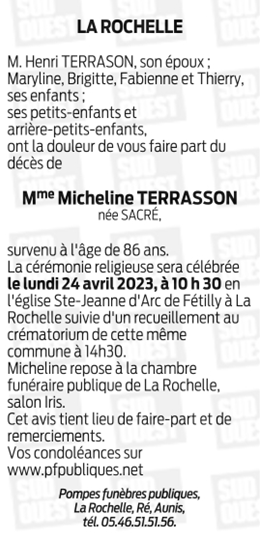 Décédée à La Rochelle (17000, France) le lundi 17 avril 2023 à l'âge de 86 ans