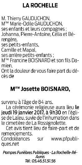 Décédée à La Rochelle (17000, France) le dimanche 15 janvier 2017 à l'âge de 84 ans