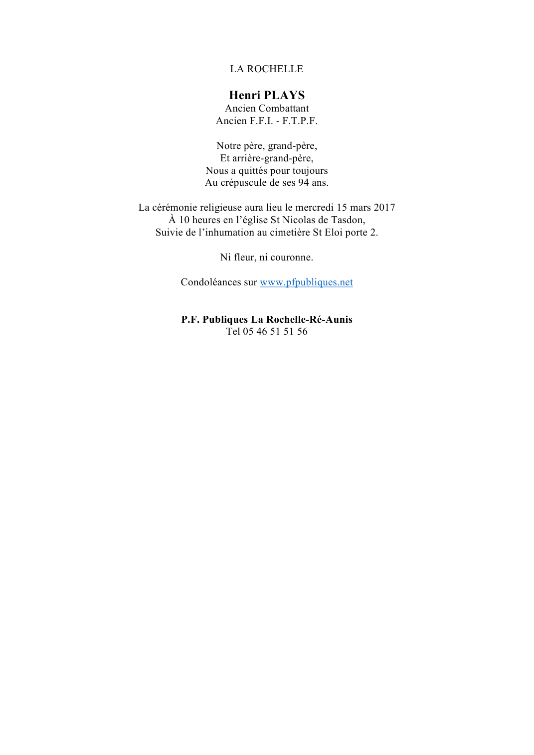 Décédé à La Rochelle (17000, France) le samedi 11 mars 2017 à l'âge de 93 ans