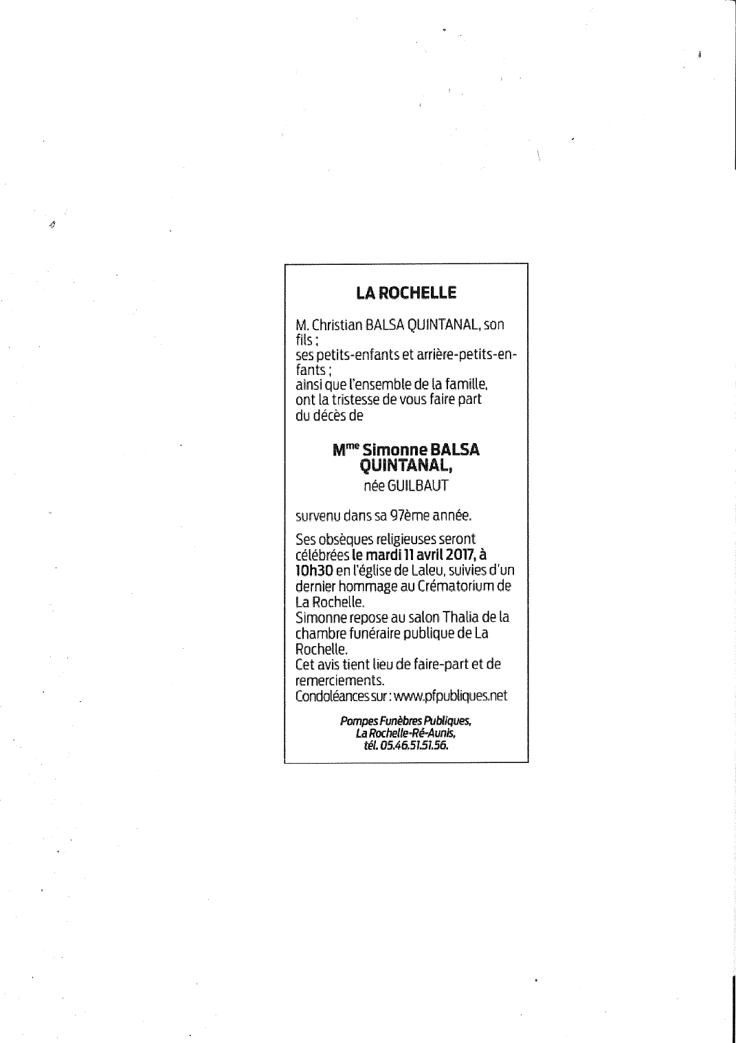 Madame Simonne BALSA QUINTANAL née GUILBAUT