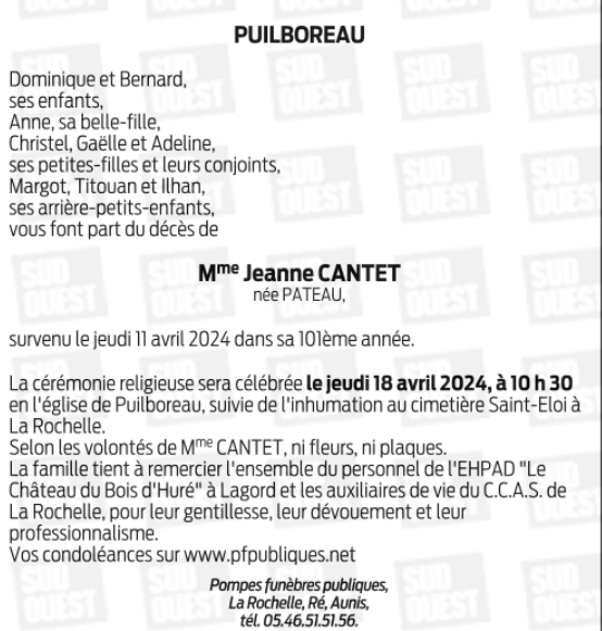 Madame Jeanne CANTET née PATEAU