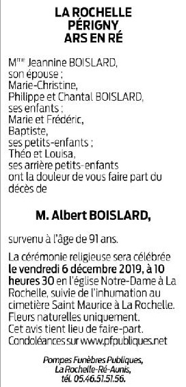 Décédé à La Rochelle (17000, France) le mardi 3 décembre 2019 à l'âge de 91 ans