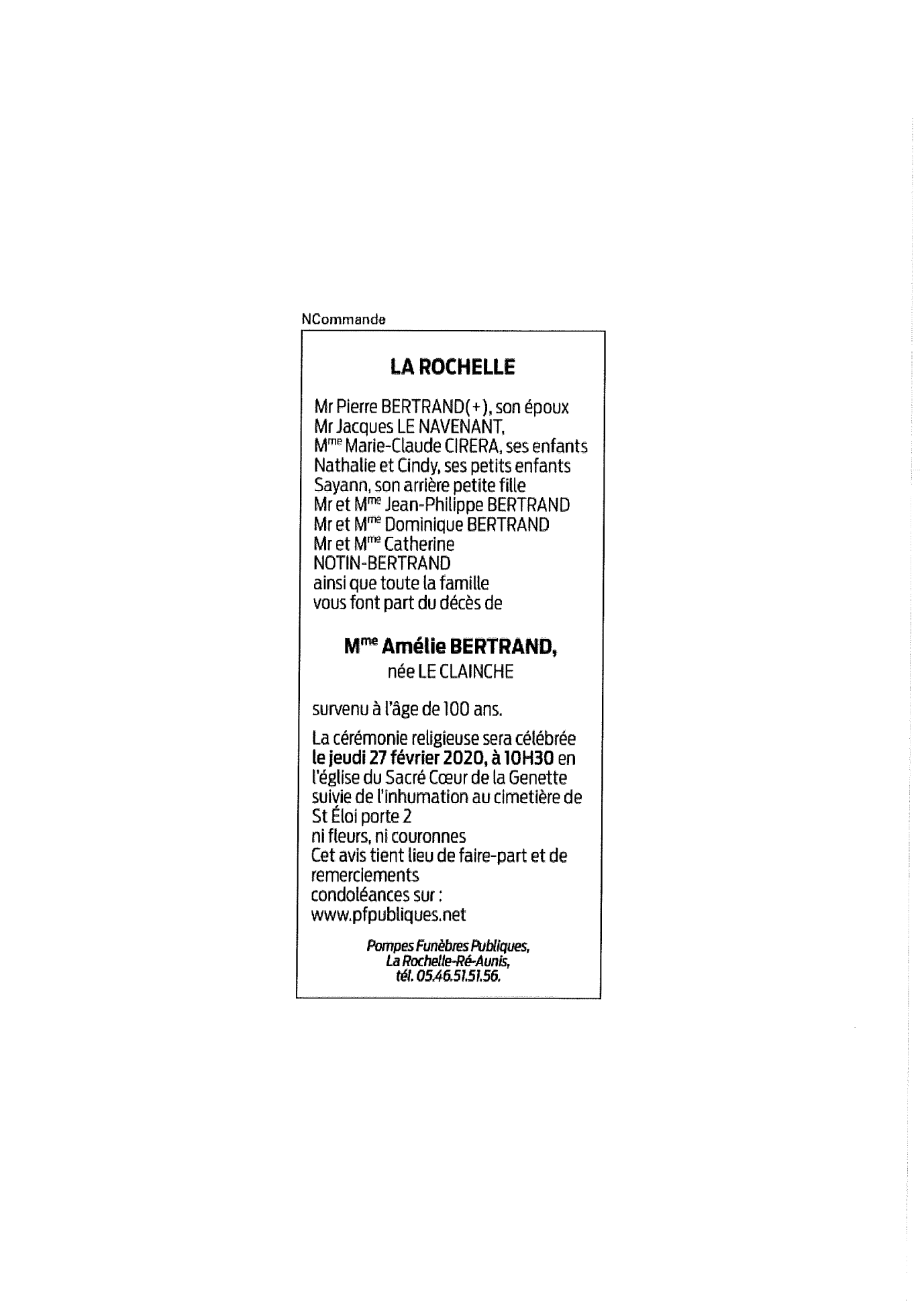 Décédée à La Rochelle (17000, France) le dimanche 23 février 2020 à l'âge de 100 ans