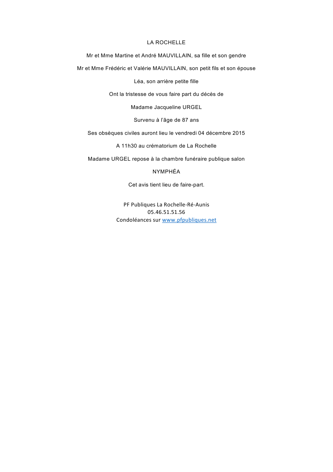 Décédée à La Rochelle (17000, France) le mardi 1 décembre 2015 à l'âge de 87 ans