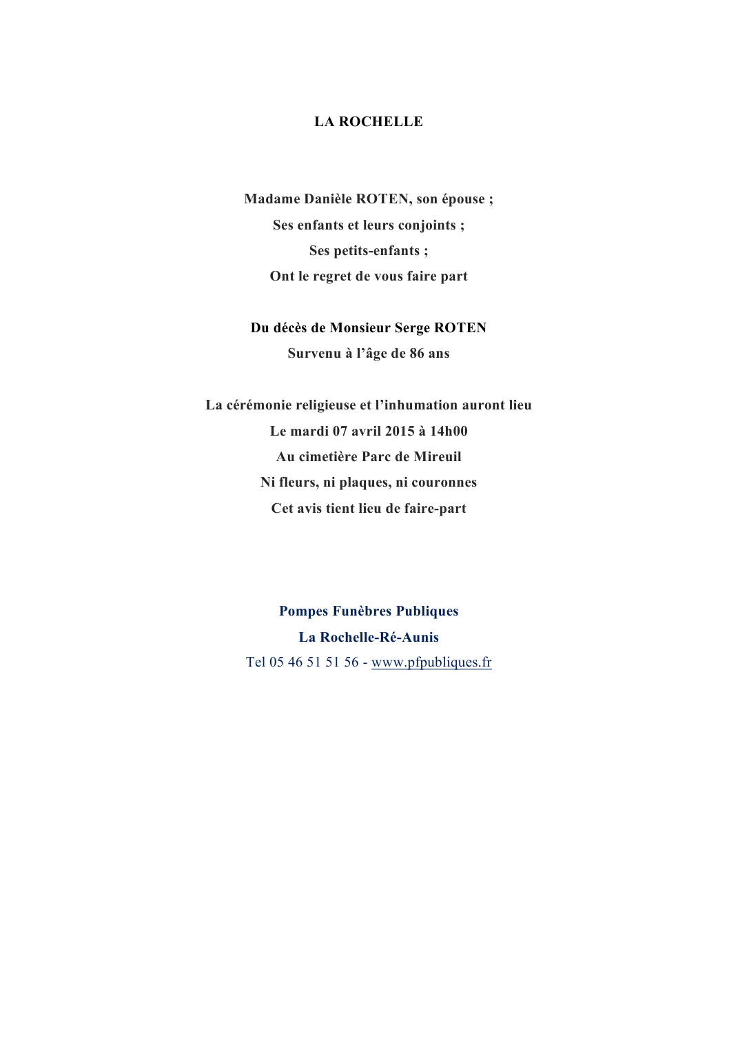 Décédé à La Rochelle (17000, France) le vendredi 3 avril 2015 à l'âge de 86 ans