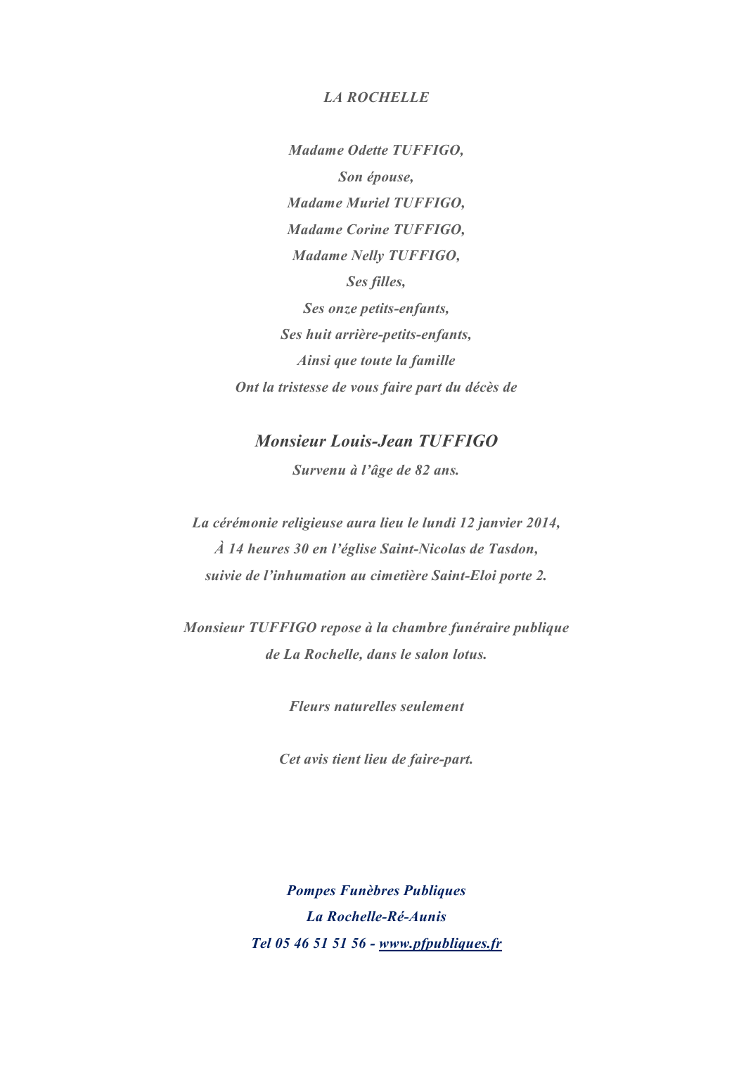 Décédé à La Rochelle (17000, France) le jeudi 8 janvier 2015 à l'âge de 82 ans
