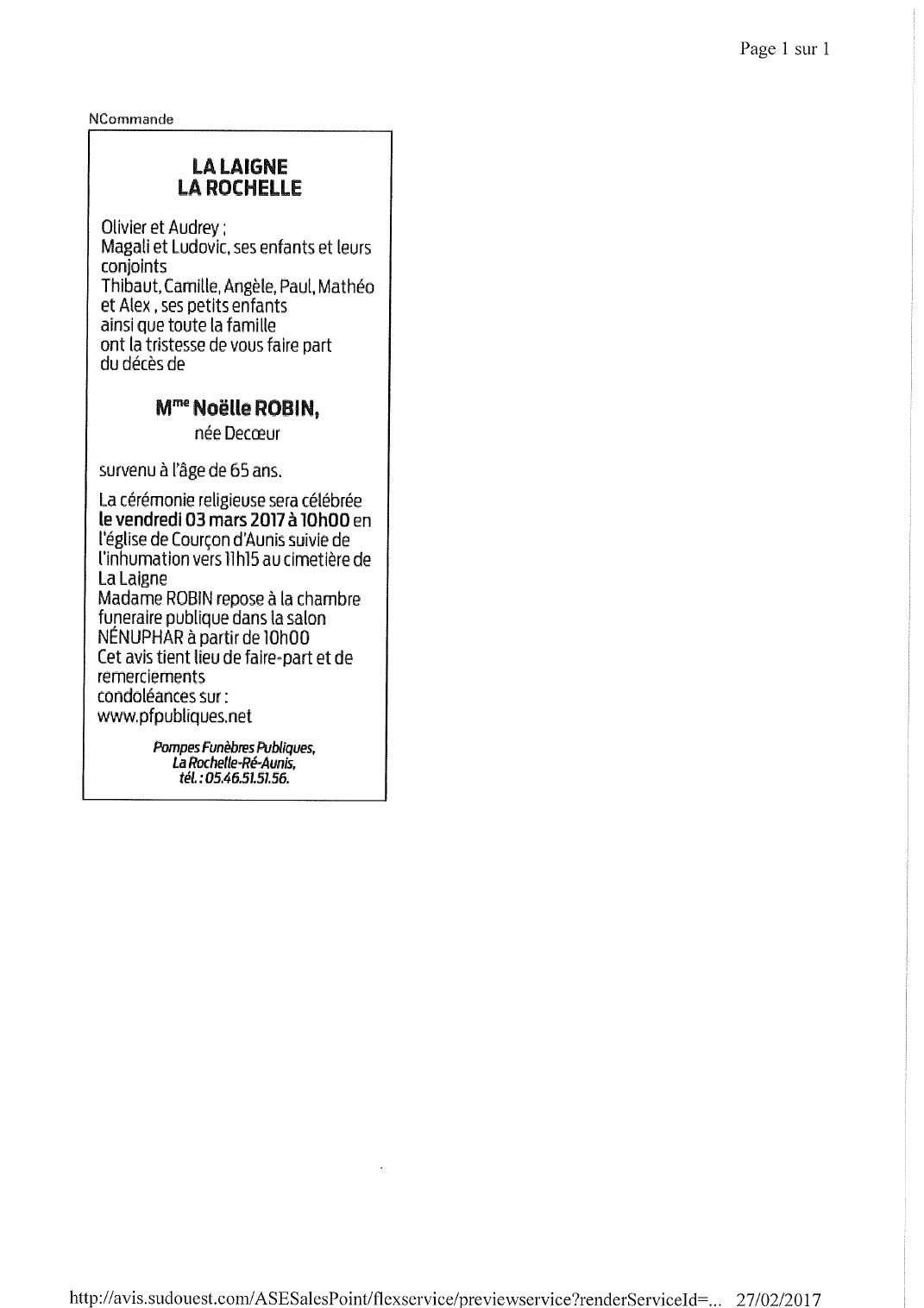 Veuve de Monsieur Joël ROBIN