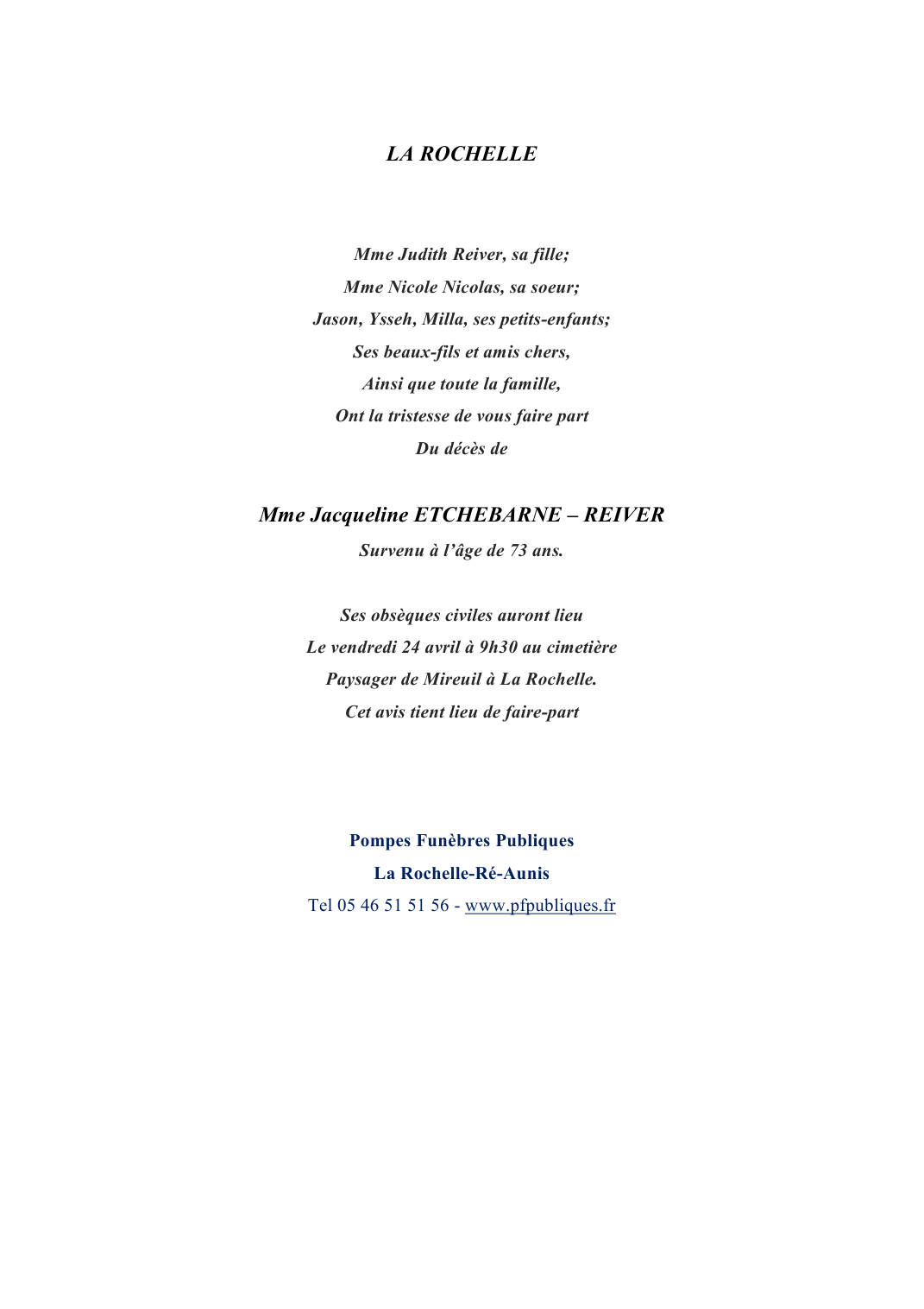Décédée à Aytré (17440, France) le mardi 21 avril 2015 à l'âge de 73 ans