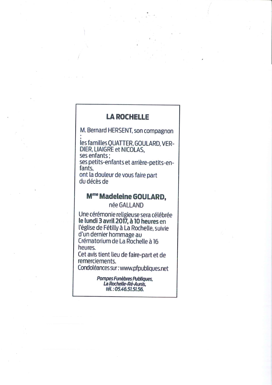 Décédée à La Rochelle (17000, France) le mardi 28 mars 2017 à l'âge de 82 ans