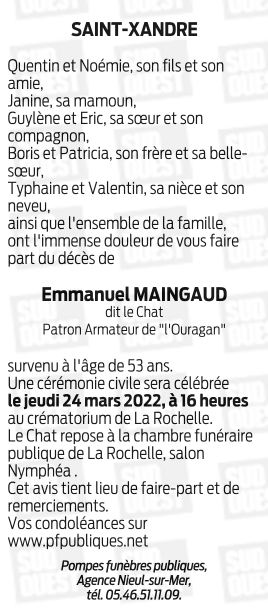 Décédé à Saint-Xandre (17138, France) le lundi 14 mars 2022 à l'âge de 53 ans
