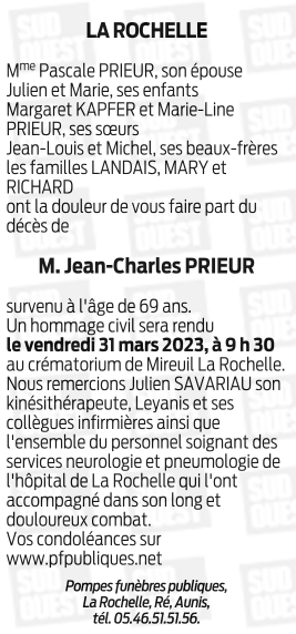 Décédé à La Rochelle (17000, France) le jeudi 23 mars 2023 à l'âge de 69 ans