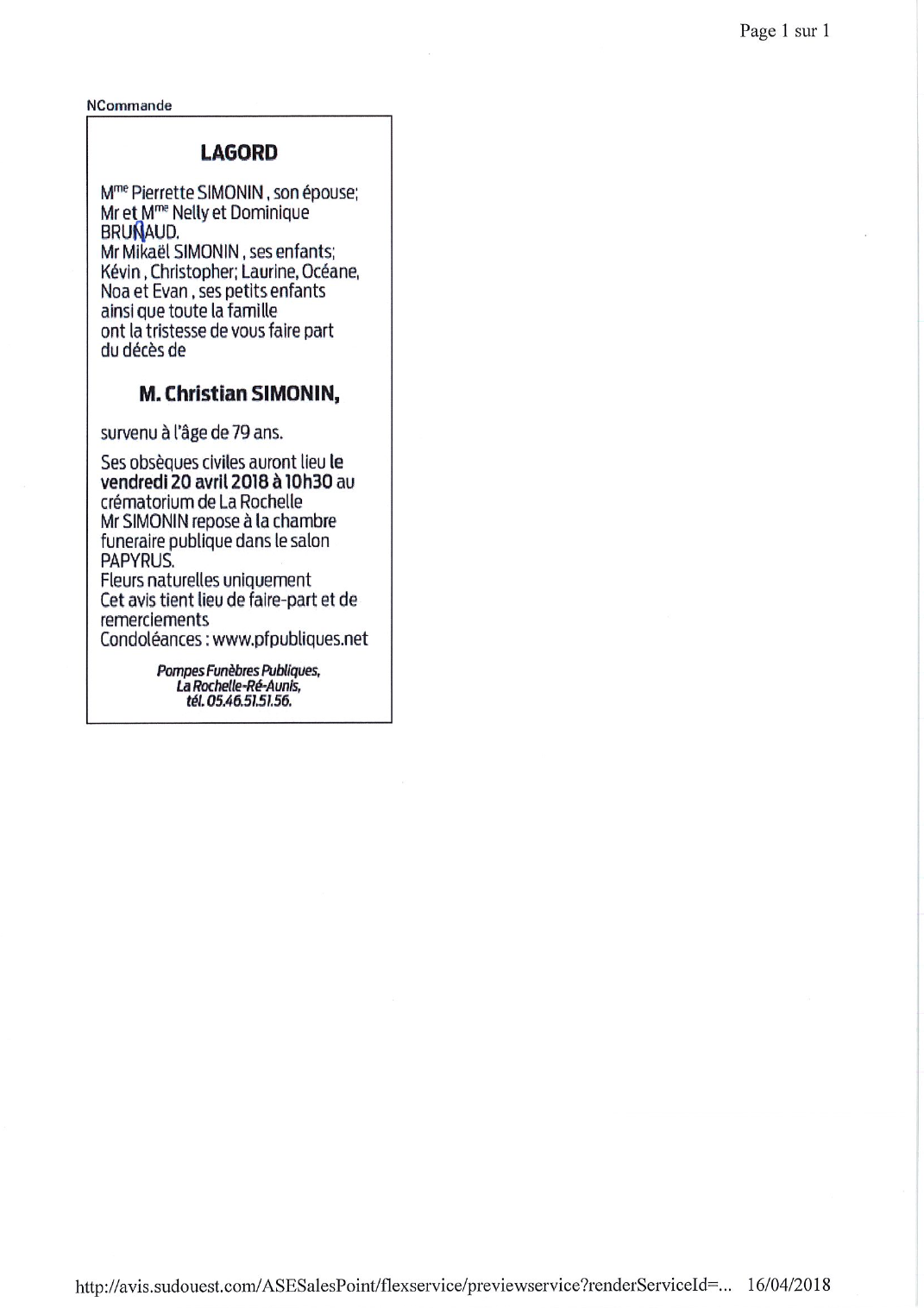 Décédé à Lagord (17140, France) le dimanche 15 avril 2018 à l'âge de 79 ans